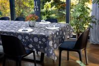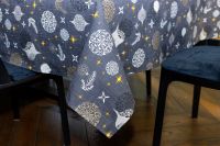 Świąteczny obrus wykonany z bawełny. Stonowany wzór na elegancki stół. Występuje w wielu rozmiarach, również w wersji granatowej z powłoką akrylową.