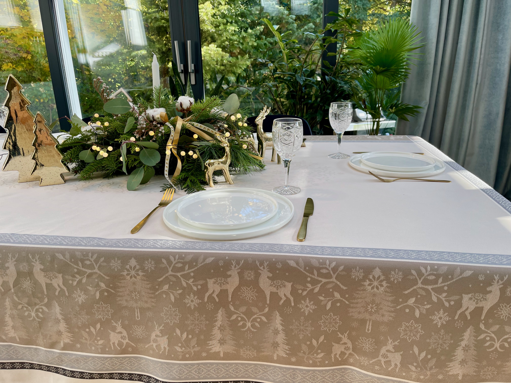 Przepiękny klasyczny obrus świąteczny wykonany z bardzo dobrej jakościowo 100% bawełny żakardowej. Idealne zestawienie beżu brązu z kolorem écru idealnie podkreśli powagę świąt Bożego Narodzenia. Delikatne wzory świąteczne w stonowanej kolorystyce dodatkowo podkreślają charakter uroczystości. Możemy być pewni, że tak udekorowany stół zaskoczy niejednego gościa czy członka rodziny.